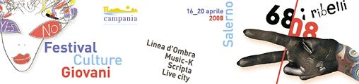 Nato come Linea d’Ombra SalernoFilmFestival, festival di cinema che giunge quest’anno alla tredicesima edizione, Festival Culture Giovani è dal 2006 un contenitore multidisciplinare di esperienze creative e si articola su più livelli. L’edizione 2008 ha come sottotitolo e tema guida “68_08: i ribelli” collegato ai quaranta anni dal Sessantotto.Il programma del festival si svilupperà entro l’universo delle culture giovani in quattro ambiti, ognuno con un marchio forte e riconoscibile.Linea d’Ombra SalernoFilmFestival(cinema) Music-K (musica) Scripta (scritture creative) LiveCity (video arte e multimedialità).