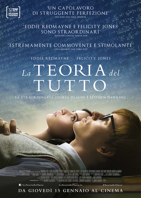 “La teoria del tutto” è la storia straordinaria ed edificante di una delle più eccelse menti viventi del mondo, il famoso astrofisico Stephen Hawking, e di due persone che resistono alle più grandi difficoltà attraverso l’amore. Il film, tratto dal memoir Travelling to Infinity: My Life with Stephen, di Jane Hawking, è diretto dal premio Oscar James Marsh (Man on Wire – Un uomo tra le torri).