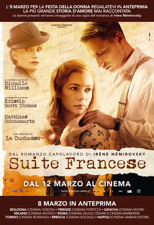 Dal celebrato romanzo di Irène Némirovsky, SUITE FRANCESE, è il racconto dell’amore bruciante di un uomo e una donna travolti dalla Storia. Ambientato in Francia nel 1940, il film narra della bellissima Lucile Angellier (interpretata da Michelle Williams, tre volte candidata all’Oscar® per Brokeback Mountain, Blue Valentine,Marylin e vincitrice di un Golden Globe e un Independent Spirit Award per Marilyn) che nell’attesa di ricevere notizie del marito prigioniero di guerra, vive un’esistenza soffocante insieme alla suocera, donna dispotica e meschina i cui panni sono indossati da Kristin Scott Thomas (premio BAFTA per Quattro matrimoni e un funerale e una nomination all’Oscar® per Il paziente inglese). La vita di Lucile viene stravolta quando i parigini in fuga si rifugiano nella cittadina dove vive e la città viene invasa dai soldati tedeschi che occupano le loro case. Inizialmente Lucile ignora la presenza di Bruno (Matthias Schoenaerts, Un sapore di ruggine e ossa, e protagonista di Bullhead, candidato all’Oscar® come Miglior Film Straniero), un raffinato ufficiale tedesco che è stato dislocato nella loro abitazione. Ma dopo un’iniziale indifferenza, Lucile “si risveglia” e inizia a esplorare sentimenti sepolti che la porteranno inevitabilmente verso Bruno…