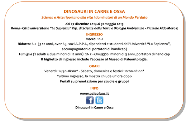A Roma sono arrivati i dinosauri. In occasione dell’uscita di “Jurassic World”, da giovedì 11 giugno 2015 in tutte le sale, ci sarà la mostra Dinosauri in Carne e Ossa – Scienza e Arte, che riporterà alla vita i dominatori di un Mondo perduto, per passare dall’emozione della visione 3D provata al cinema all’emozione 3D da toccare con mano.
