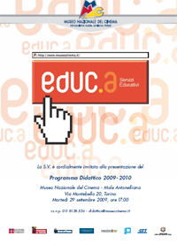 Martedì 29 settembre 2009 alle ore 17.00 il Museo Nazionale del Cinema ha presentato la nuova “Guida ai Servizi Educativi per le scuole” che illustra le iniziative per l’anno scolastico 2009-2010.