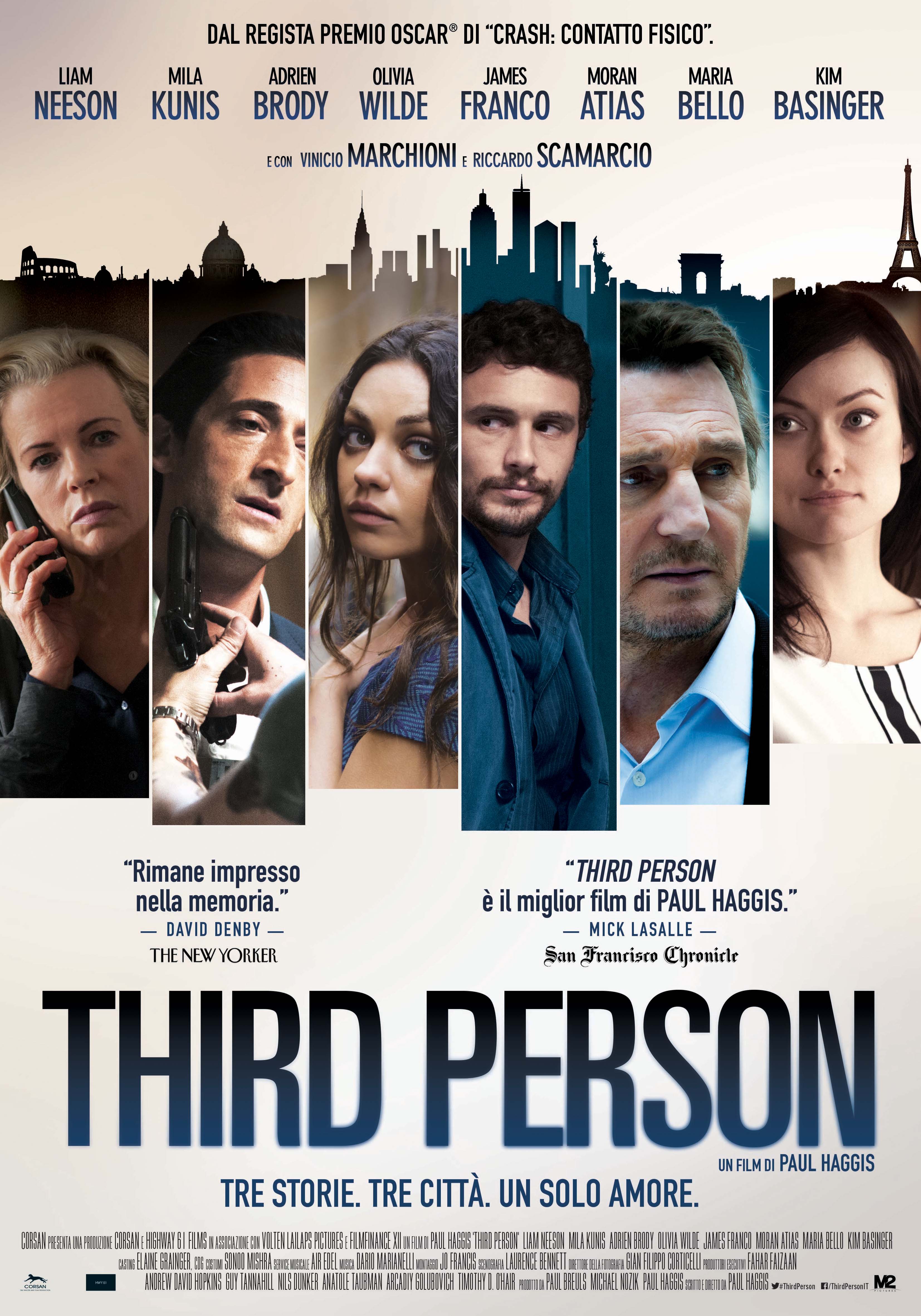 “Third Person” è il nuovo film di Paul Haggis con Liam Neeson, Olivia Wilde, Adrien Brody, Moran Atias, James Franco, Mila Kunis, Kim Basinger e Maria Bello, in più c’è la collaborazione di Vinicio Marchioni e Riccardo Scamarcio.